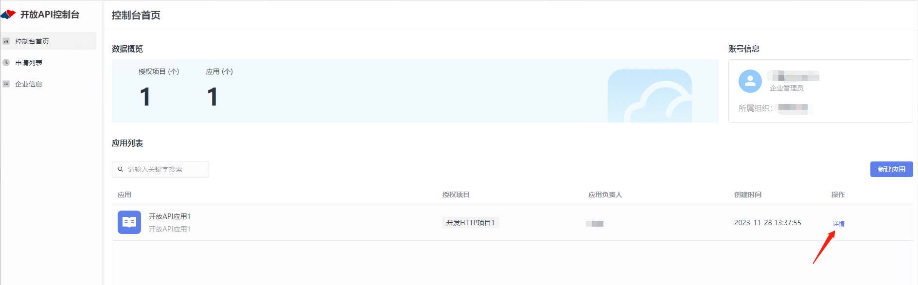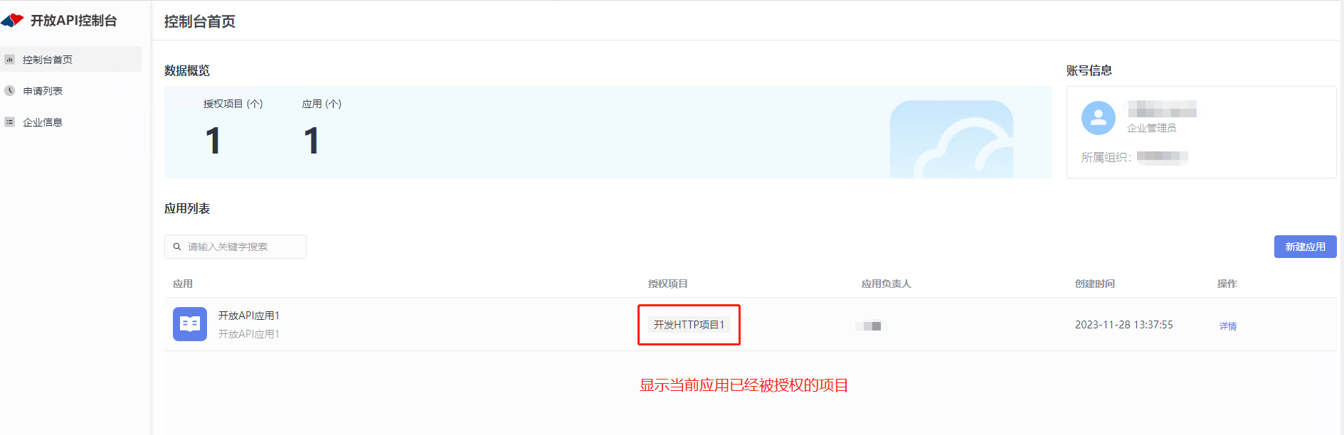 1、申请审批通过后,应用列表显示当前应用已经被授权的项目